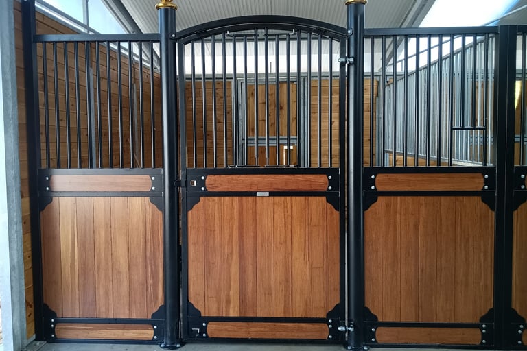 A porta da box pode ser de batente ou de correr, havendo a possibilidade, também, de ter uma janela dupla de abrir na grelha da porta ou uma grelha com um visual curvo.