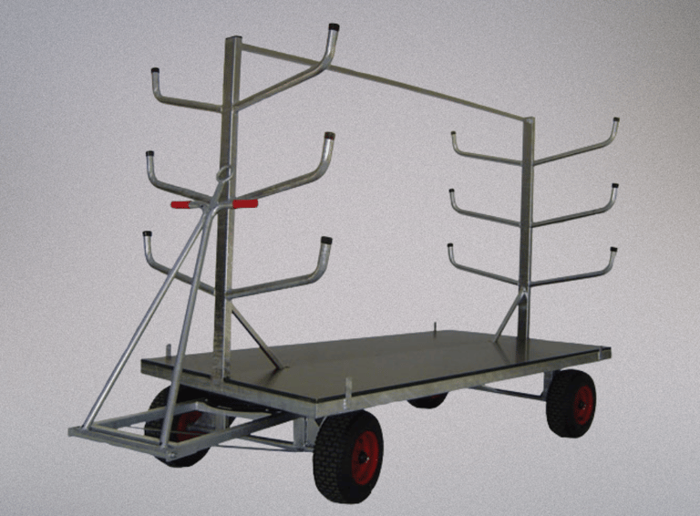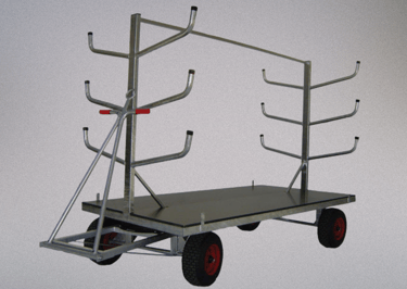 Estrutura em aço galvanizado com capacidade até 120 varas, com direção giratória com caixa de esferas, barra de tração em forma de tesoura, uma plataforma de madeira compensada revestida de resina e rodas pneumáticas e travão de mão automático nas rodas dianteiras.