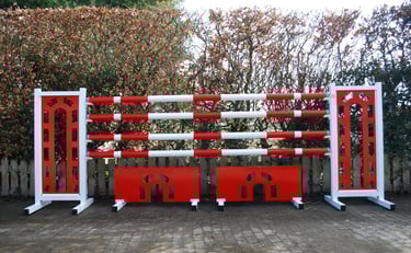 Obstáculos com design pré concebido (conforme imagens) com estrutura em alumínio, para uma maior durabilidade, e varas de 3,00mts. Incluem suporte de varas e bandeiras