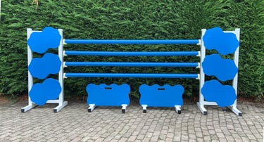 Obstáculos com design pré concebido (conforme imagens) com estrutura em alumínio, para uma maior durabilidade, e varas de 3,00mts. Incluem suporte de varas e bandeiras
