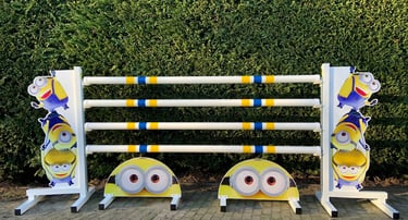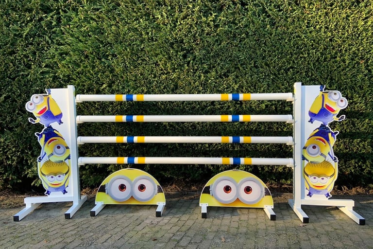 Pre-designed jumps (as shown in images) with aluminum structure for enhanced durability and 3.00 m poles. Includes pole holders and flags.