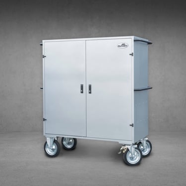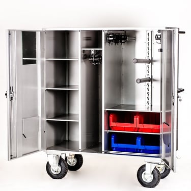 It stores 2 saddles, has 4 side shelves and 4 plastic bins for ample storage, and includes a mirror on the door for final touch-ups.