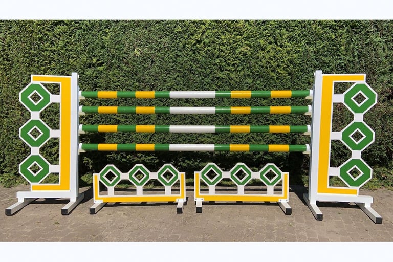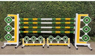 Obstáculos con diseño predefinido (ver imágenes), estructura de aluminio para mayor durabilidad y varas de 3,00 m. Incluye soportes para varas y banderines.
