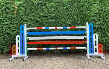 Obstacles avec design préconçu (voir images), structure en aluminium pour une plus grande durabilité, barres de 3,00 m. Inclus : support de barres et fanions.