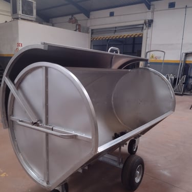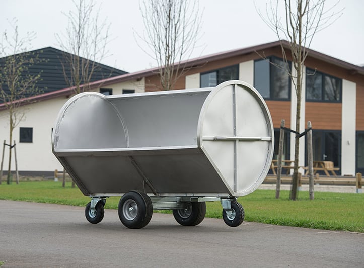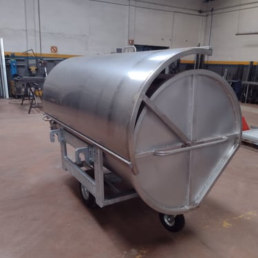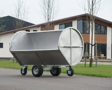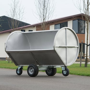 Conteneur en inox pour le transport de fumier avec une capacité de 2,40 m³ / 2400 litres, doté de 2 roues fixes et 2 pivotantes, poids total de 260 kg.