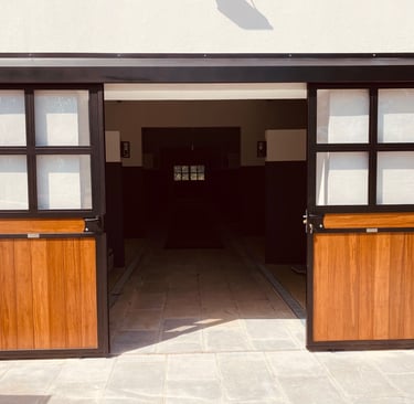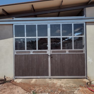 Portões para a entrada do seu estábulo personalizados à sua medida, conforme as necessidades do seu espaço. Podendo ter um acabamento galvanizado ou galvanizado e lacado na cor pretendida e ter tábuas em compósito plástico de 32mm ou em bambu.