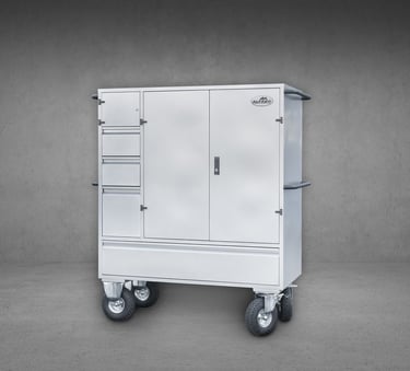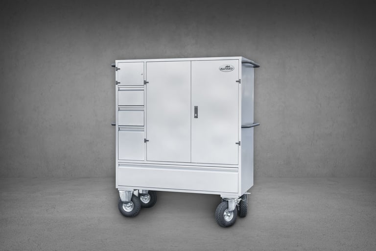 Tem uma grande capacidade de armazenamento, com 3 gavetas na vertical e uma na horizontal para arrumação de cobrejões, suadouros ou outro material.