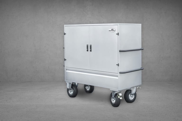 É apoiada em quatro rodas pneumáticas de ⌀260 sendo que 2 são fixas e 2 são rotativas, todas elas com sistema de travão, para facilitar o transporte em competições ou no estábulo.