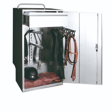 Tem capacidade para armazenar 2 selas e 3 bridões e com uma gaveta para arrumação de cobrejões ou outro material.