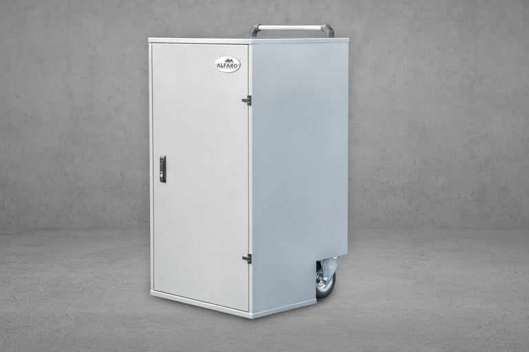 Possui uma fechadura para que o seu material esteja seguro e é apoiada em duas rodas para facilitar o transporte em competições ou no estábulo.