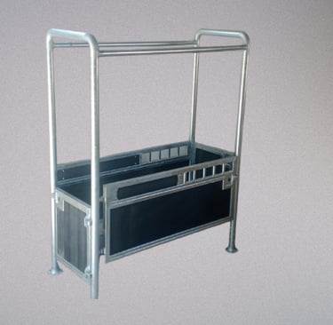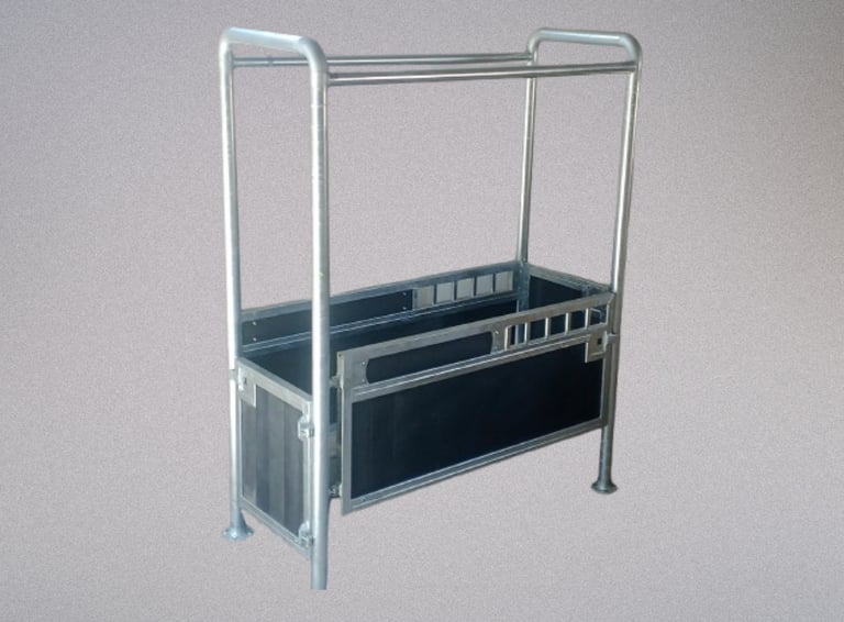 Tronco de contenção para equinos, com capacidade para 1 cavalo. Fabricado em tubo metálico de perfil redondo de 3,2mm de espessura galvanizado a quente, com portas nas extremidades e abertura lateral com comprimento igual ao do tronco.